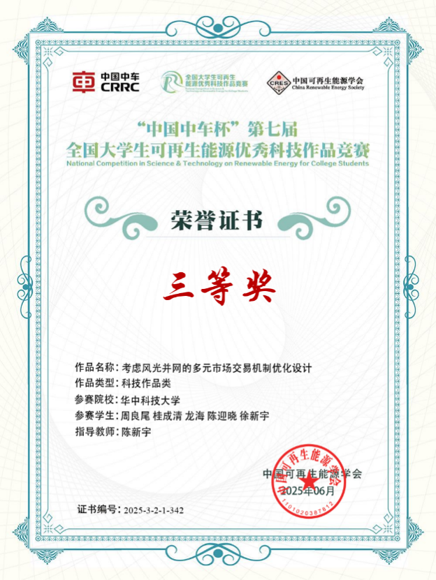 2024年9月26日-11月30日,由中国可再生能源学会主办的“中国中车杯”第七届全国老员工可再生能源优秀科技作品竞赛顺利举行,来自全国305所高校提交的2013项参赛作品。经形式审查后,符合参赛要求的作品共计1615项。最终评选出614项作品入围。其中,科技作品类555项,社会实践调研类59项。晋级决赛289支队伍(获奖比例为18%),三等奖272支队伍(获奖比例为38%)。永利yl23411集团学子龙海参与完成作品“考虑风光并网的多元市场交易机制优化设计”获得三等奖。