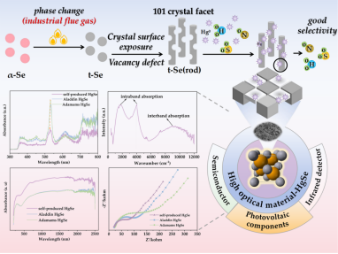 2023年,《水俣公约》第五次缔约方大会(COP5)限制了汞的排放与使用后,中国作为全球最大汞排放国与消费国,在汞污染防控和汞资源保障方面面临双重挑战。基于硒与汞强亲和性赋予的显著脱汞优势,当前研究聚焦于构筑硒化物活性位点的脱汞材料,以突破单质硒固有高键能和高反应能垒的技术瓶颈。传统高温再生法虽可实现吸附剂循环,但其高能耗特性制约其工程化应用。值得关注的是,Ⅱ-Ⅵ族半导体材料硒化汞因优异光学特性在光电子器件领域具应用潜力,而高活性无定形硒(α-Se)虽展现室温高效捕汞能力,却在工业烟气中易转变为低活性三角晶型硒(t-Se)。因此,通过精准调控策略构建高活性的t-Se,既可定向合成高附加值汞产物,又能规避传统工艺的杂质干扰难题,实现了环境和经济双重效益。