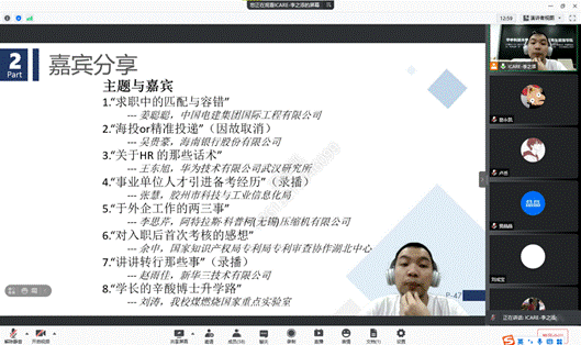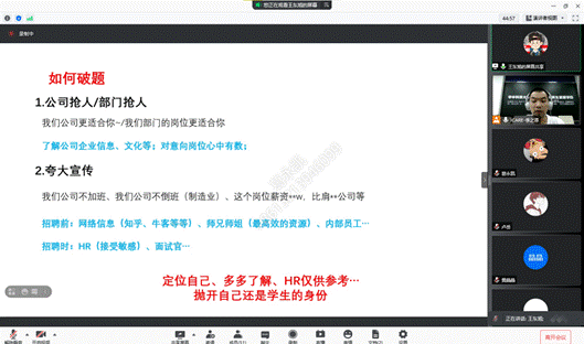 李之添先向大家介绍了本次活动的目的与流程,在做简要介绍后嘉宾们逐一开始自己的分享。姜聪聪提到“明确自身定位”在求职过程中的重要性,找到适合自己的目标岗位与第一份工作,将对职业发展奠定坚实基础;而HR的职责决定其描述与承诺有模糊和夸大的成分,王东旭提醒大家多留心、勤调查,洞悉了“HR的话术”背后的秘密;张慧以事业单位报考相关文件为基础介绍了自己的事业单位人才引进备考经历和相应建议;李思芹讲述自己在外资企业的工作经历与心路历程以及如何在外资企业中明确自身定位,实现心态转变的过程;余申则根据自己入职期间的学习与考核过程同大家分享了自己的感悟;赵雨佳结合自身经历告诉大家只要保持“力争优秀”的习惯,转行其实并非难事;刘涛列举自己曲折求职升学路径,在点出升学诸多途径与关键时间节点的同时,向大家展示“人生可以迷茫,但要坚持努力”的道理。