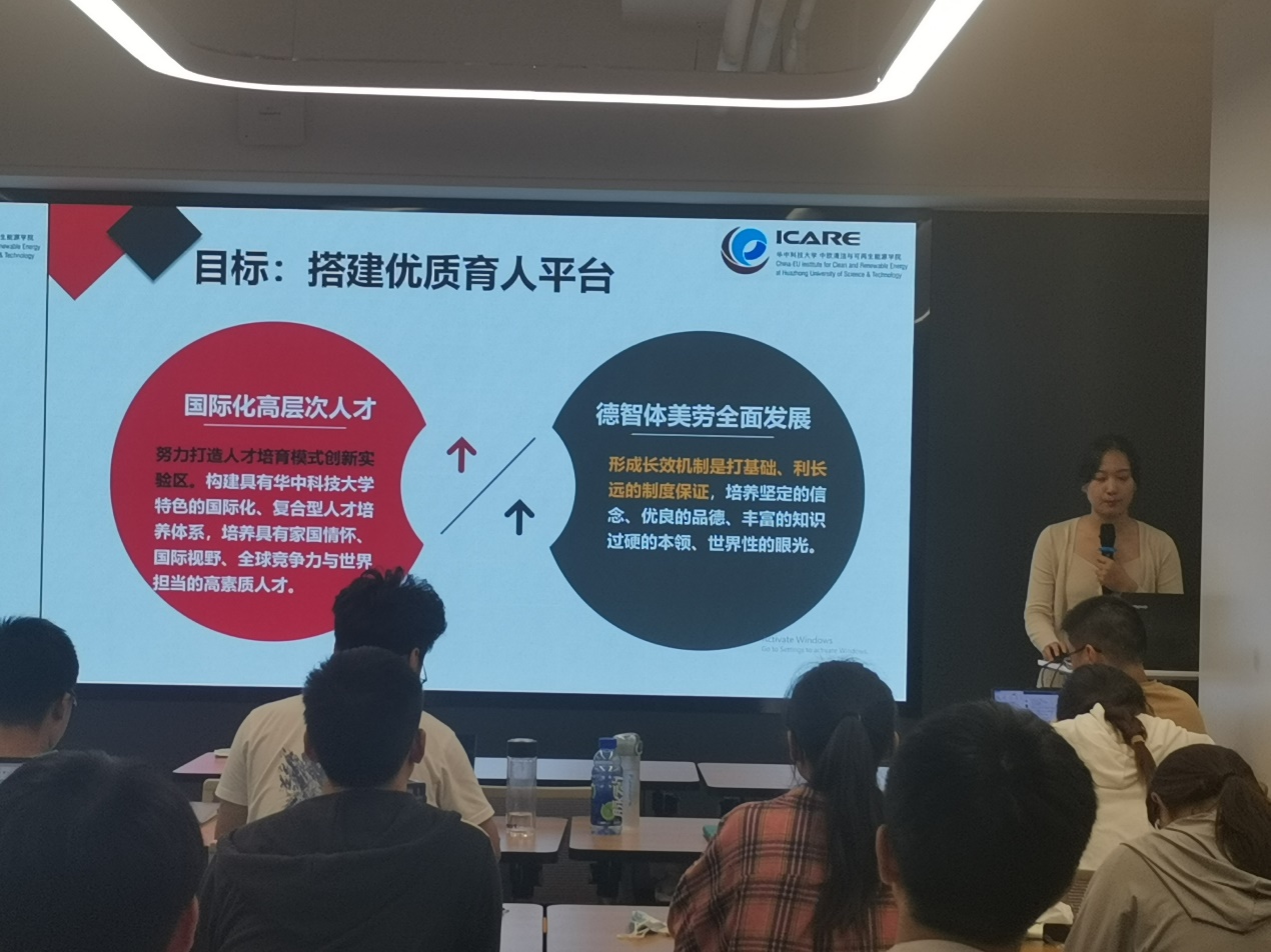 最后辅导员赵怡婷分别从思想政治教育、党建、日常管理、资助与安全等方面向同学们详细介绍了公司的员工工作情况,解读了《中欧清洁与可再生能源五育学分管理办法(试行)》,她希望通过五育学分的管理办法,帮助同学们成为德智体美劳全面发展的社会主义合格建设者和可靠接班人。