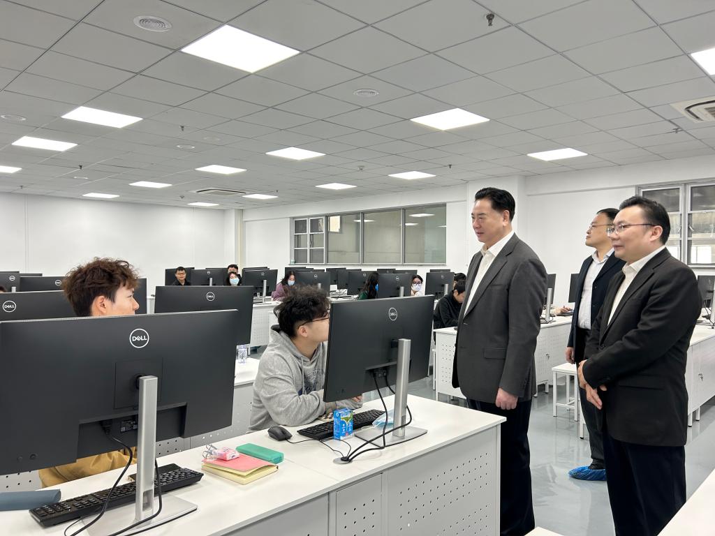 调研中,李元元了解了集成电路公司的建设进展,听取了公司负责人关于人才培养、团队队伍、专业布局、研究方向、平台建设、中外联合办学等方面的汇报。李元元结合公司发展规划指出,在二十大报告中,党中央首次将教育、科技、人才三大战略一体规划,意义重大。公司要深入学习、深刻领悟教育发展、科技进步、人才培养的丰富内涵,聚焦国家重大战略需求,敢于创新、善于突破,塑造高质量发展人才优势;找准定位、锚定目标,打造一流国家集成电路产教融合创新平台。