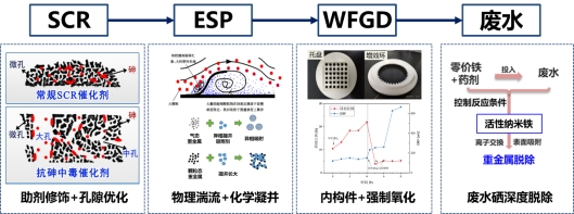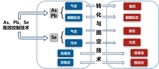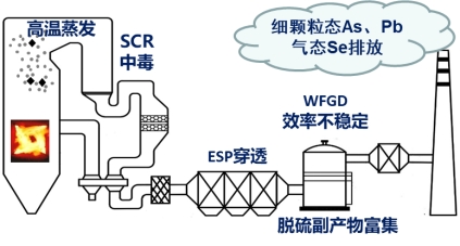 项目团队发现燃烧过程中重金属形态迥异导致化学反应调控区间普适性不强,砷、铅、硒在细颗粒中富集后其质量浓度分布与烟尘浓度分布不一致,导致电厂超低排放控制技术和装置无法有效协同控制重金属。此外,挥发性强的硒化合物逃逸除尘设备后,部分迁移至脱硫液中造成二次污染,部分甚至以气态形式直接排入大气。这些瓶颈问题对我国燃煤电厂重金属排放控制技术的开发带来巨大挑战,迫切需要针对典型和高重金属煤种开展技术研发。本成果创新性地通过抑制气态重金属的生成、强化现有装置对重金属的协同捕集、控制易逃逸的细颗粒态重金属、提高重金属的稳定性,针对煤中重金属含量及燃烧过程迁移差别形成相应关键控制技术,突破我国燃煤电厂重金属的排放控制瓶颈。