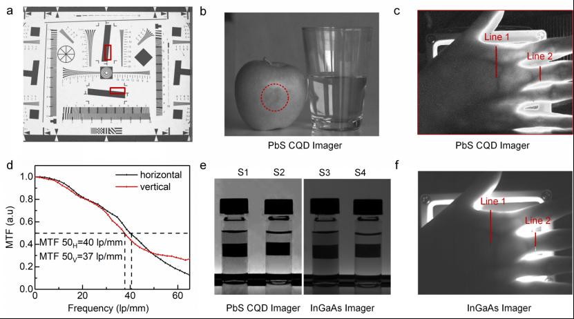 该团队制备的CQD成像芯片具有可媲美商用InGaAs芯片的成像效果,其横向和纵向的分辨率可达40 lp/mm和37 lp/mm(图3)。在红外光下水果的碰伤损伤和皮下静脉血管清晰可见,展示了PbS CQD红外成像芯片在水果检测、溶剂识别、静脉成像等方面的应用,证明了其广泛的应用潜力。
