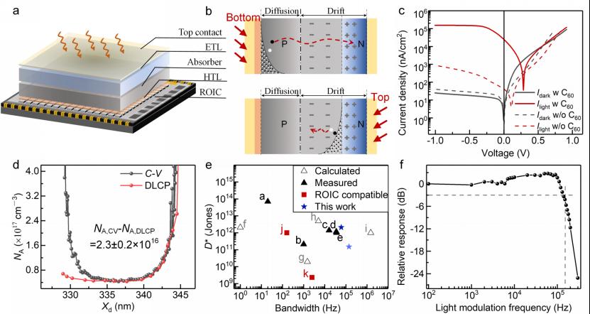 为此,唐江教授团队合成出激子吸收峰在940nm的PbSCQD并通过配体交换获得量子点浆料。根据PbS CQD的特性,设计出了适配硅基ROIC的顶入射结构的光电二极管,通过模拟分析和实验优化器件结构,使耗尽区靠近入射光,实现光生载流子的有效分离与收集,从而提高器件外量子效率。针对制备中磁控溅射的高能粒子对PbS CQD界面的损伤,通过引入C60界面钝化层降低界面缺陷,通过驱动级电容和电容-电压测量分析证明了探测器缺陷浓度降低至2.3×1016cm−3,接近广泛研究的PbS CQD光电二极管的最佳值(图1)。文中报道的顶入射PbS CQD光电二极管的响应截止波长约1150nm,探测率达2.1×1012Jones,−3dB带宽为140 kHz,线性动态范围超过100 dB。