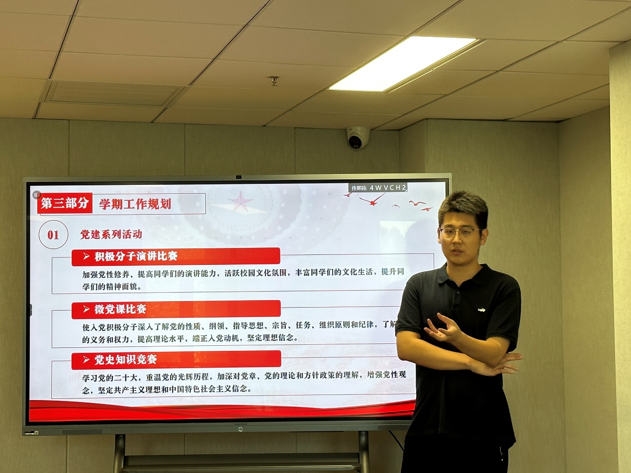 党建德育助理王家轩介绍了党务中心各个部门的工作职责,以及公司党务中心的学期工作规划,重点强调各部门既要各司其职也要互帮互助,推进党团班一体化建设,例如办好演讲比赛等形式的党建系列活动,抓牢推动“一支一品”品牌建设等重点工作,开展每个月的主题党日和团日活动。殷切表达党务中心成员仍需加强理论学习和实践学习,在思想和行动上都起到带头作用。